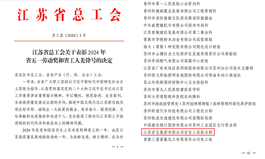 日前,江蘇省總工會發(fā)布關于表彰2024年省五一勞動獎和省工人先鋒號的決定,江蘇宏寶集團有限公司宏寶工具技術部光榮上榜!